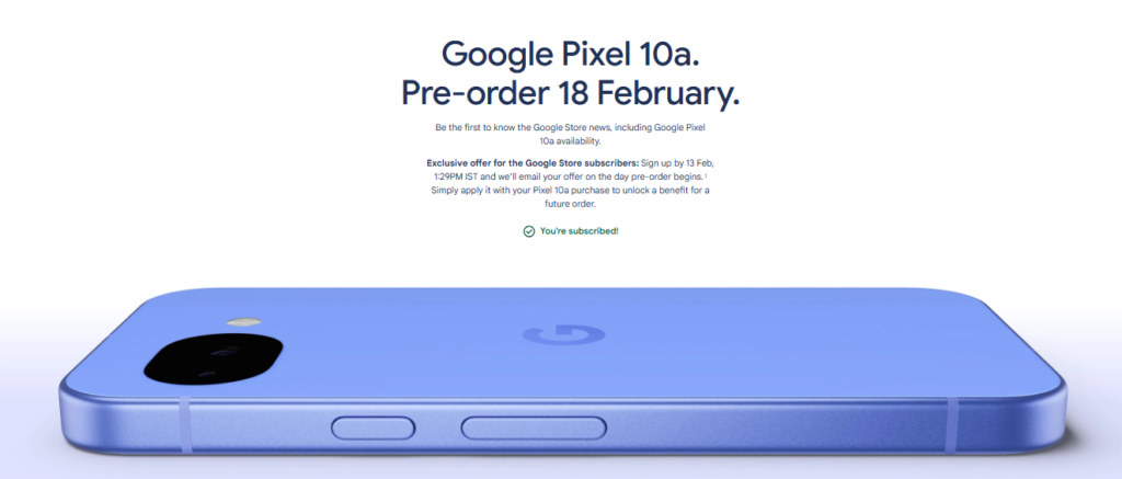 Google ने आधिकारिक तौर पर पुष्टि कर दी है कि Pixel 10a की प्री-ऑर्डर शुरू होगी 18 फरवरी 2026 से। इस दिन फोन को Google स्टोर और संभवतः अन्य ई-कॉमर्स प्लेटफॉर्म पर बुक किया जा सकेगा। इसके बाद फोन की सेल मार्च की शुरुआत में शुरू होने की उम्मीद है। यह तारीख पिछले मॉडल्स की तुलना में थोड़ा पहले लॉन्च होने वाली है, जिससे Google mid-range सेगमेंट में प्रतिस्पर्धा को तेज करना चाहता है।