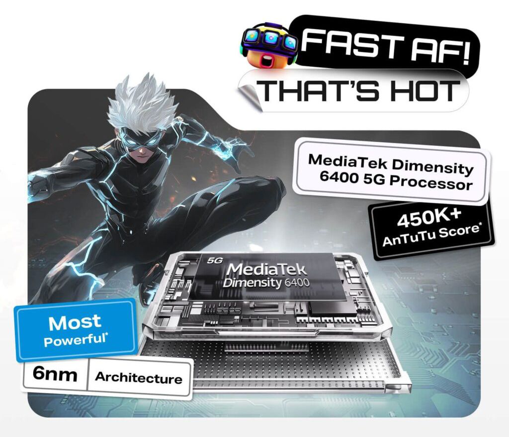 ✓ प्रोसेसर: यह MediaTek Dimensity 6400 चिपसेट द्वारा संचालित है, जो 6nm प्रोसेस पर बना है। इसमें ऑक्टा-कोर CPU (2x Cortex-A76 @ 2.5GHz और 6x Cortex-A55 @ 2GHz) और Mali-G57 MC2 GPU शामिल है। यह चिपसेट 450K+ का AnTuTu स्कोर देता है, जो मिड-रेंज परफॉर्मेंस के लिए शानदार है।