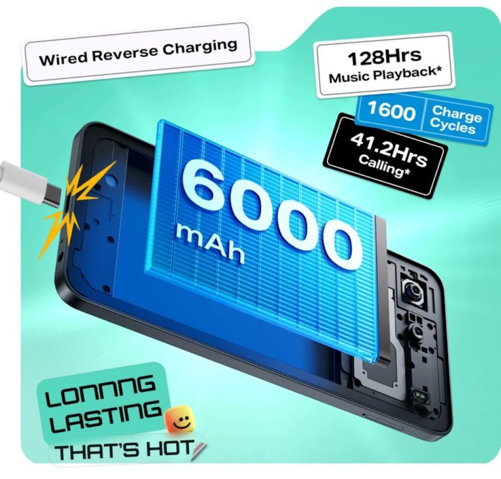 ✓ क्षमता: इसमें 6000mAh की दमदार बैटरी है, जो 128 घंटे तक म्यूजिक प्लेबैक और 41.2 घंटे तक कॉलिंग टाइम प्रदान करती है।
