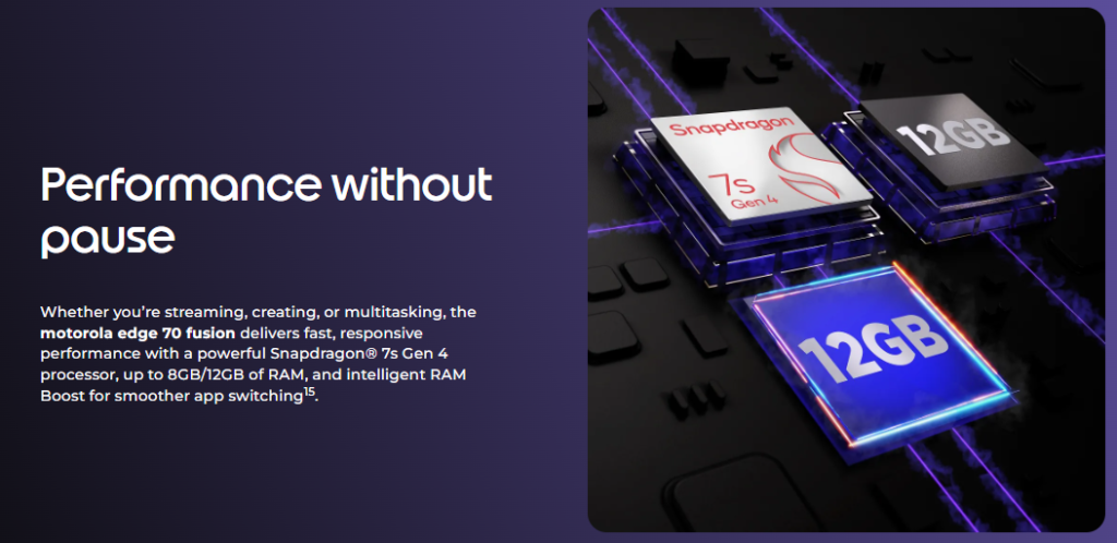 स्मार्टफोन मार्केट में लगातार नई तकनीक और बेहतर फीचर्स वाले फोन लॉन्च हो रहे हैं। इसी कड़ी में Motorola ने अपना नया स्मार्टफोन Motorola Edge 70 Fusion लॉन्च किया है। यह फोन खासतौर पर उन यूज़र्स के लिए बनाया गया है जो पावरफुल परफॉर्मेंस, शानदार कैमरा और लंबी बैटरी लाइफ चाहते हैं। इस स्मार्टफोन में 1.5K AMOLED डिस्प्ले, Snapdragon 7s Gen 4 प्रोसेसर, 50MP कैमरा और 7000mAh की बड़ी बैटरी जैसे कई प्रीमियम फीचर्स दिए गए हैं, जिससे यह फोन मिड-प्रीमियम सेगमेंट में एक मजबूत विकल्प बन जाता है।
