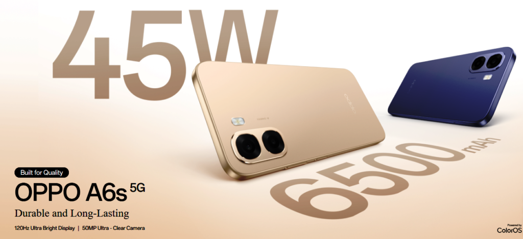 स्मार्टफोन मार्केट में बजट सेगमेंट में लगातार नए और बेहतर फीचर्स वाले फोन लॉन्च हो रहे हैं। इसी कड़ी में OPPO ने अपना नया स्मार्टफोन OPPO A6s 5G पेश किया है। यह डिवाइस उन यूज़र्स के लिए डिजाइन किया गया है जो कम कीमत में 5G कनेक्टिविटी, लंबी बैटरी लाइफ और अच्छा परफॉर्मेंस चाहते हैं। इस स्मार्टफोन में बड़ा डिस्प्ले, दमदार बैटरी और लेटेस्ट प्रोसेसर जैसे फीचर्स दिए गए हैं, जो इसे रोजमर्रा के इस्तेमाल के लिए एक अच्छा विकल्प बनाते हैं।