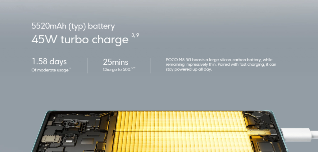 बैटरी के मामले में POCO M8 5G में 5520mAh की बड़ी बैटरी दी गई है। कंपनी के अनुसार, यह फोन एक बार चार्ज करने पर सामान्य इस्तेमाल में करीब 1.6 दिन तक चल सकता है। वीडियो स्ट्रीमिंग और गेमिंग के दौरान भी इसकी बैटरी अच्छा बैकअप देती है। फोन में 45W फास्ट चार्जिंग का सपोर्ट दिया गया है, जिससे बैटरी बहुत कम समय में चार्ज हो जाती है। इसके साथ ही इसमें रिवर्स चार्जिंग का फीचर भी मौजूद है।