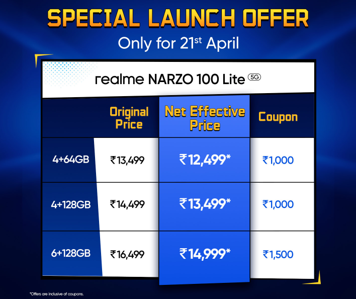 अब बात करते हैं कीमत और ऑफर्स की। realme NARZO 100 Lite 5G तीन अलग-अलग वेरिएंट्स में उपलब्ध है, जिनमें से प्रत्येक एक विशेष ‘कूपन’ ऑफर के साथ आता है।