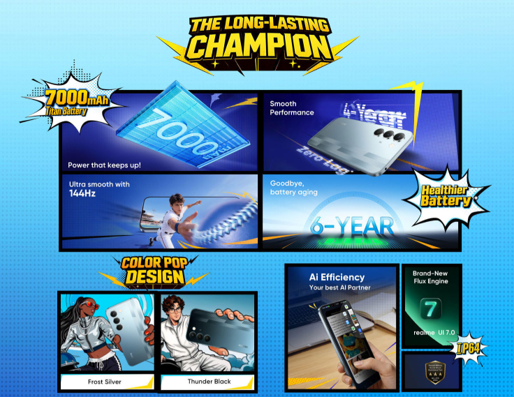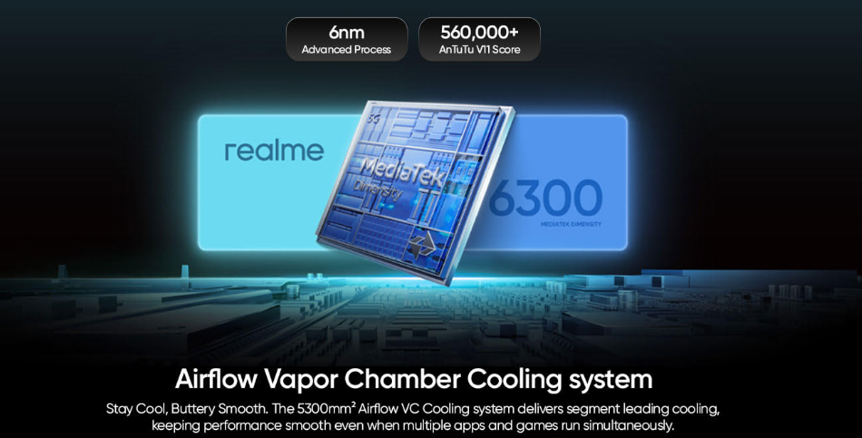 performance की बात करें तो, फोन ‘MediaTek Dimensity 6300’ 5G प्रोसेसर से लैस है, जो एक 6nm (advanced process) चिपसेट है। यह प्रोसेसर तेज गति और स्थिर प्रदर्शन का वादा करता है। इसे ‘स्मूथ परफॉर्मेंस’ (Smooth Performance) और ‘शून्य लैग’ (Zero Lag) के लिए डिज़ाइन किया गया है। realme UI 7.0 (आधारित Android 16.0) के साथ मिलकर, यह प्रोसेसर ‘ब्रांड-न्यू फ्लक्स इंजन’ (Brand-New Flux Engine) का उपयोग करता है, जो गेमिंग और ऐप्स के बीच स्विच करने को आसान और तेज बनाता है।