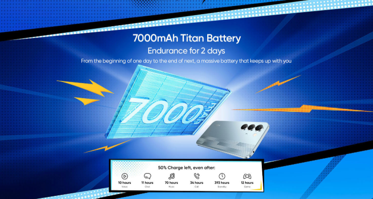 इस फोन की सबसे बड़ी ताकत, जिसे नज़रअंदाज़ नहीं किया जा सकता, वह है इसकी विशाल 7000mAh की ‘टाइटन बैटरी’ (Titan Battery)। कंपनी ने इसे सिर्फ़ ‘पावर’ नहीं कहा है, बल्कि ‘ऐसी पावर जो टिके रहे’ (Power that keeps up) कहा है। यह बैटरी वाकई अविश्वसनीय है और दावा किया जाता है कि यह दो दिनों तक का सहनशक्ति (endurance) प्रदान कर सकती है। यह इतनी दमदार है कि 50% चार्ज होने पर भी, आप 10 घंटे तक वीडियो देख सकते हैं, 11 घंटे चैट कर सकते हैं, 70 घंटे संगीत सुन सकते हैं, 34 घंटे कॉल कर सकते हैं, या 12 घंटे गेम खेल सकते हैं।