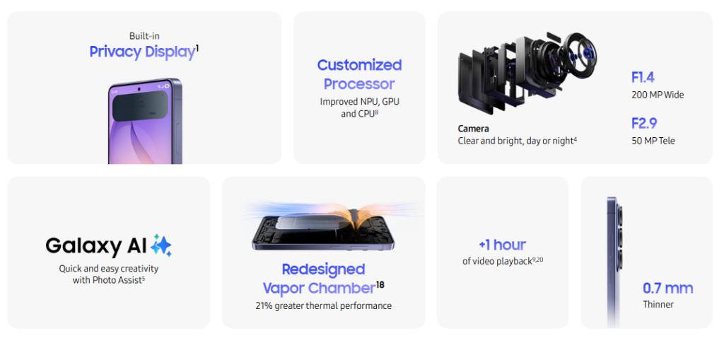 फोन Android आधारित ऑपरेटिंग सिस्टम पर चलता है और लंबे समय तक सिक्योरिटी अपडेट मिलने की उम्मीद है। कंपनी ने सुरक्षा अपडेट सपोर्ट फरवरी 2033 तक देने की जानकारी दी है, जो लंबे समय तक डिवाइस को सुरक्षित बनाए रखने में मदद करता है। Samsung DeX सपोर्ट के जरिए फोन को मॉनिटर से जोड़कर कंप्यूटर जैसा इस्तेमाल किया जा सकता है। यह डिवाइस कई एक्सेसरीज़ के साथ भी काम करता है जैसे स्मार्टवॉच, वायरलेस ईयरबड्स और फिटनेस डिवाइस। यह स्मार्ट इकोसिस्टम अनुभव को और बेहतर बनाता है, जो खास तौर पर Samsung के यूज़र्स के लिए फायदेमंद है।